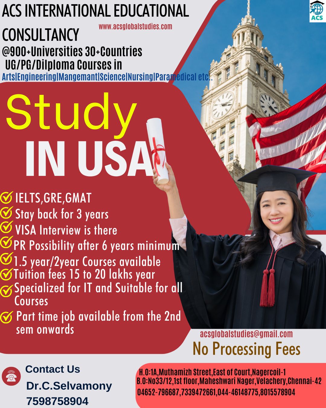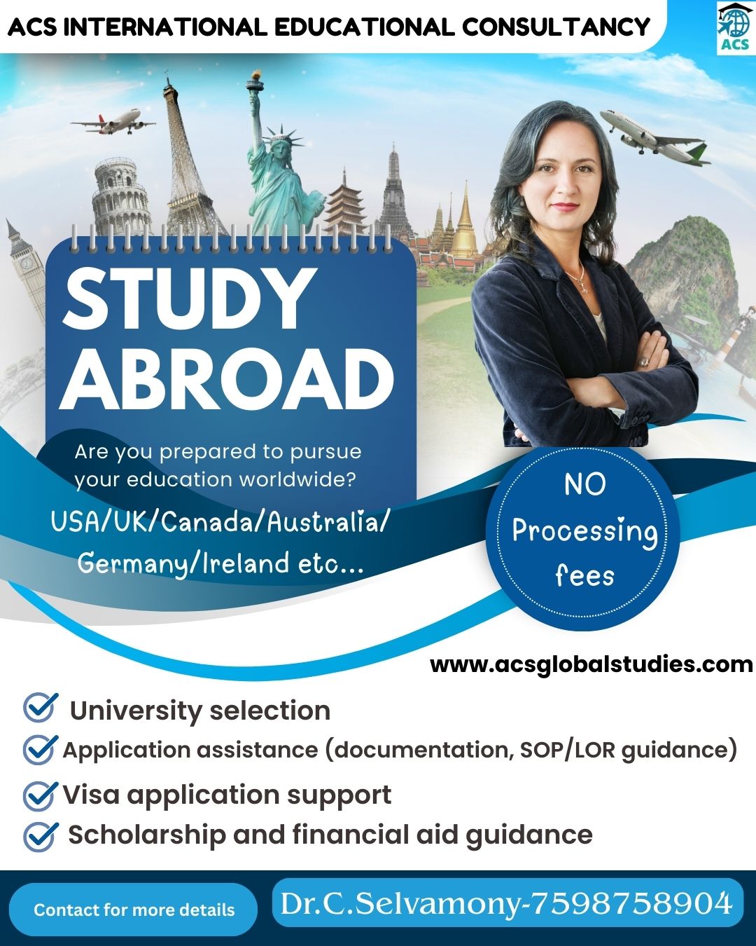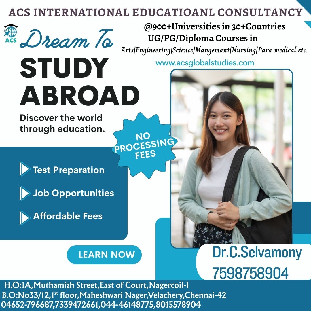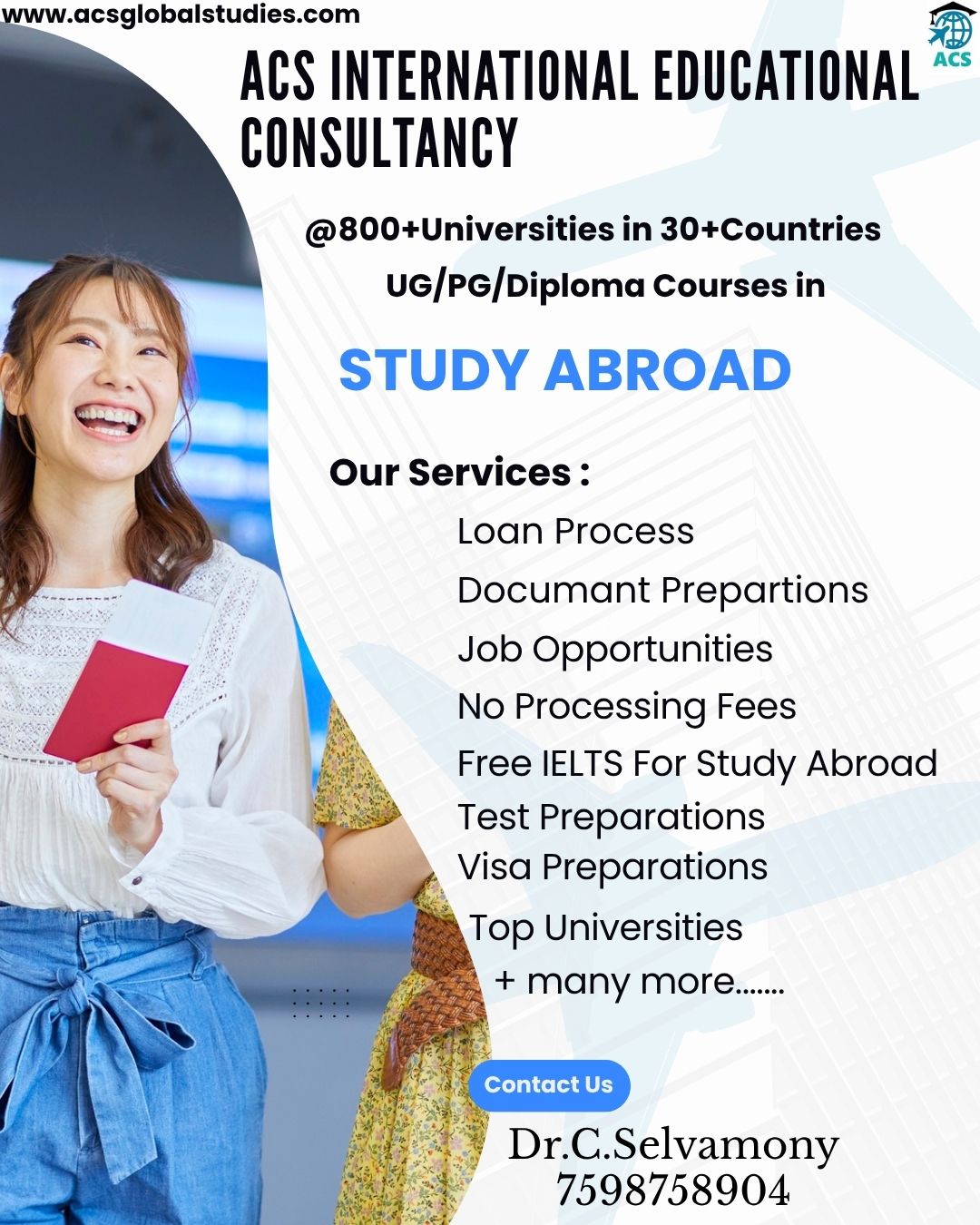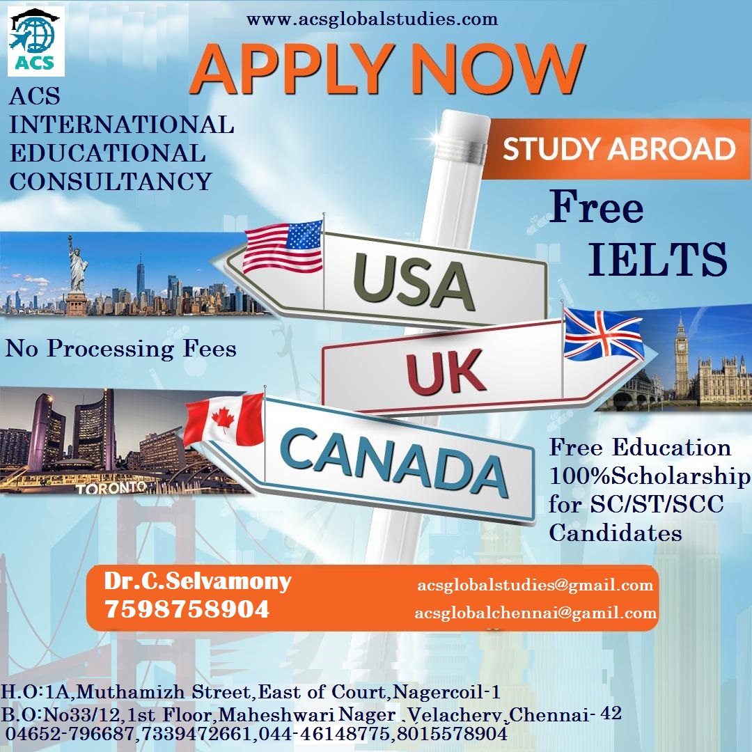 * We are Dealing with 800+ Universities in 30+ Countries * No Service Charges & No Money Dealings Free Process from students * Application to VISA Process * Free IELTS / GRE Online Coaching * One to One Free Counselling * Bank Loan Guidance