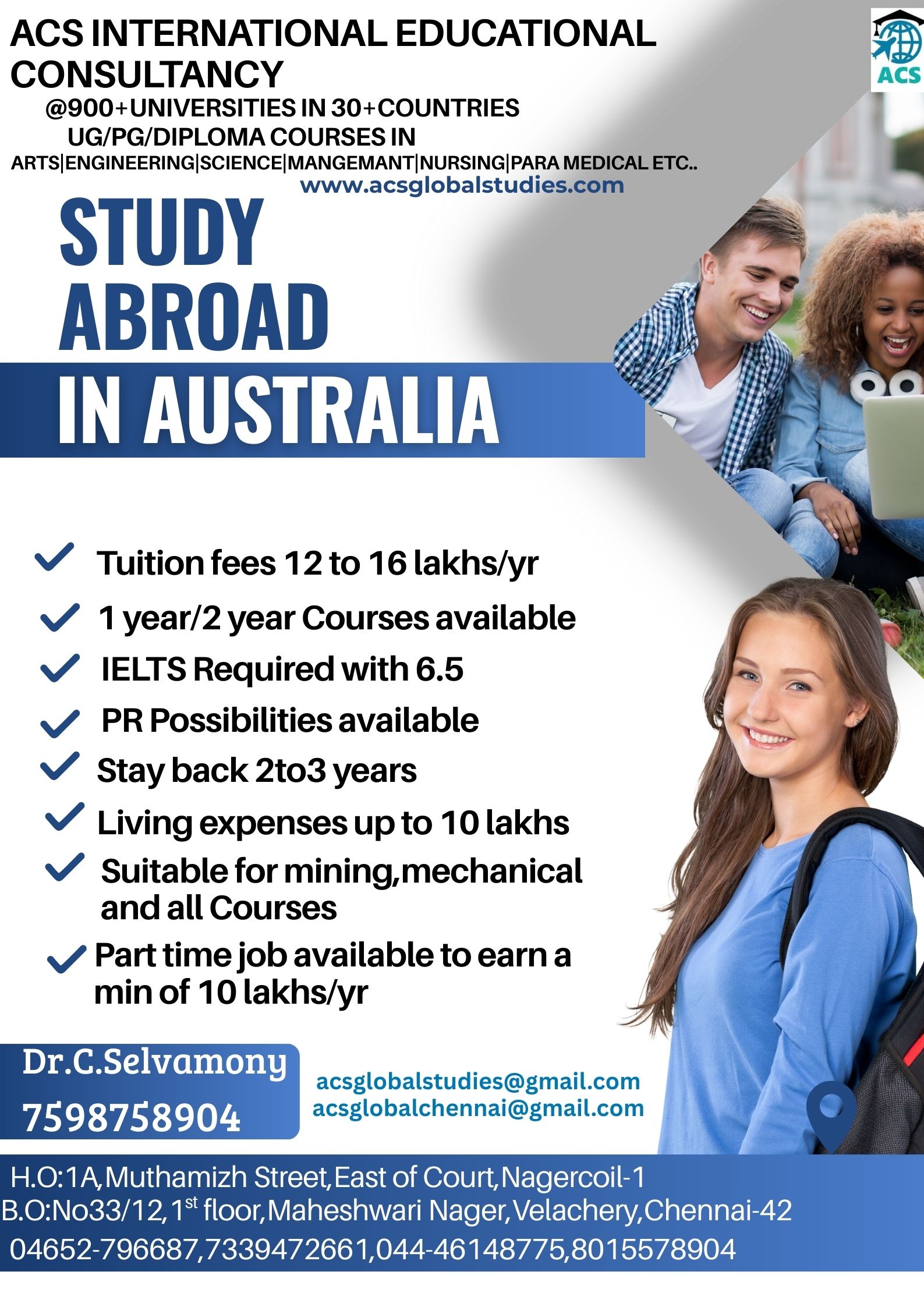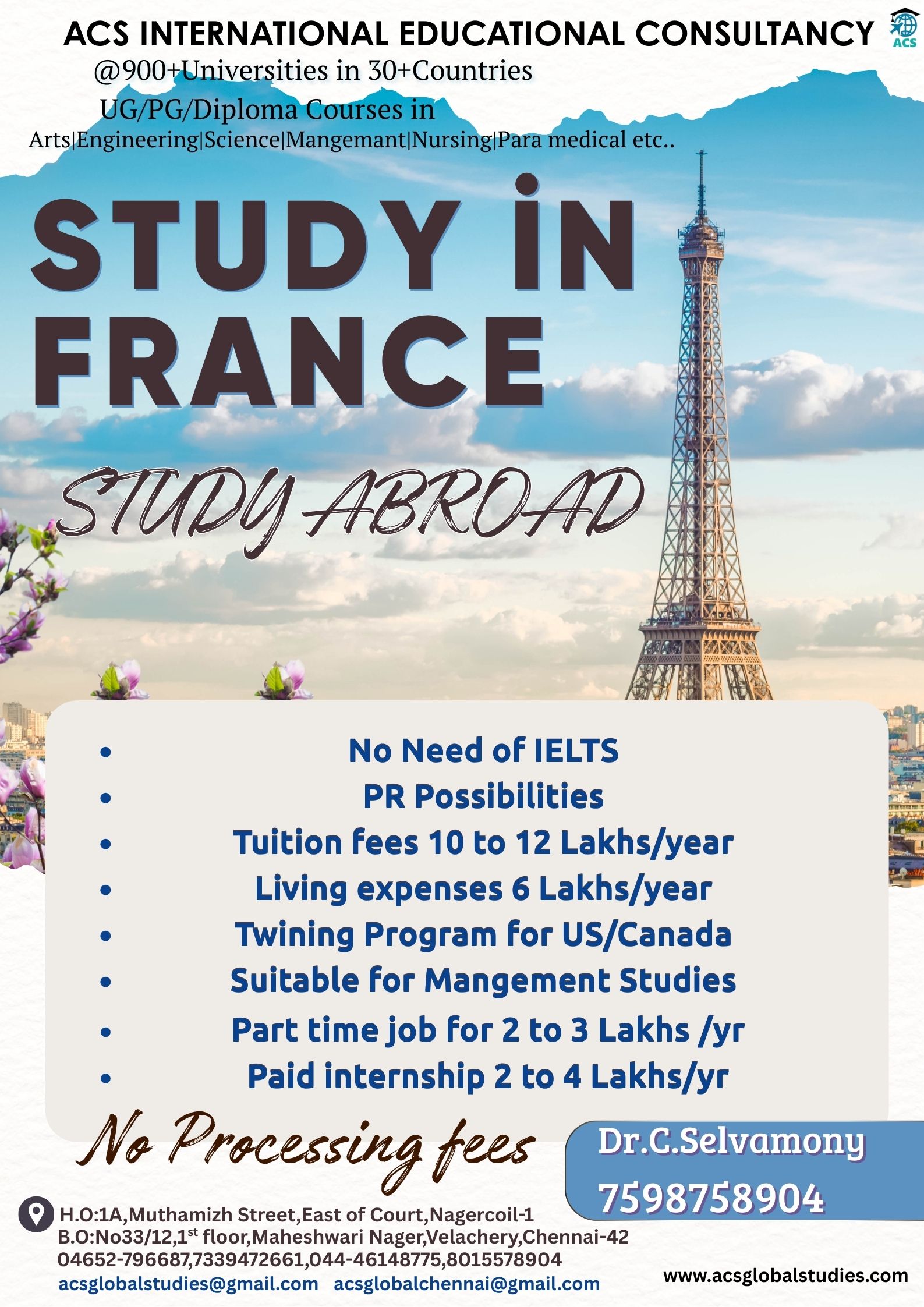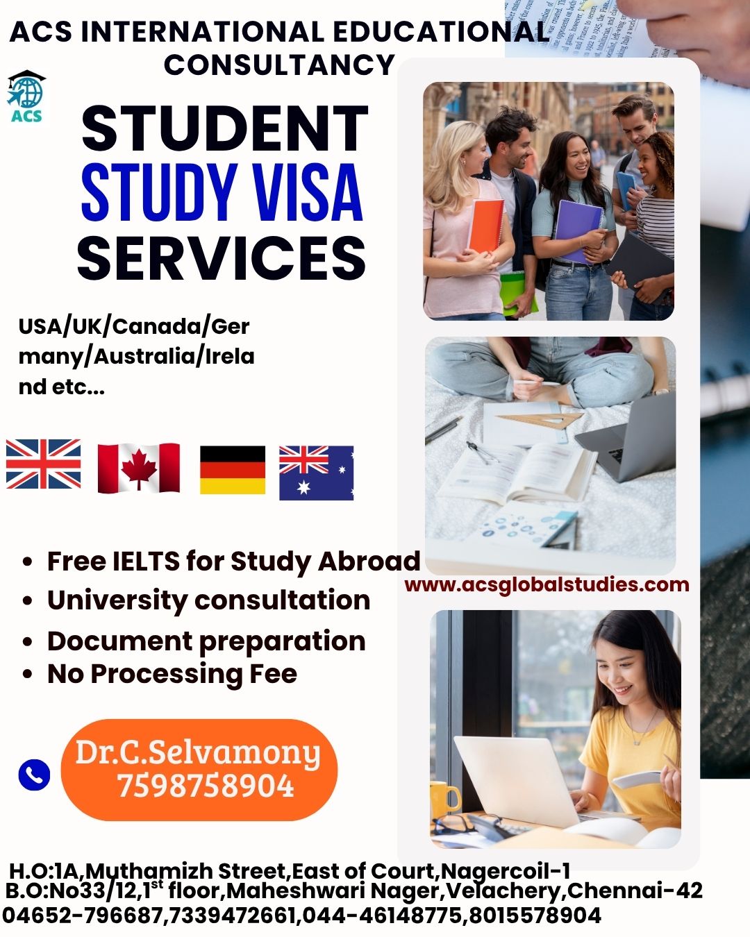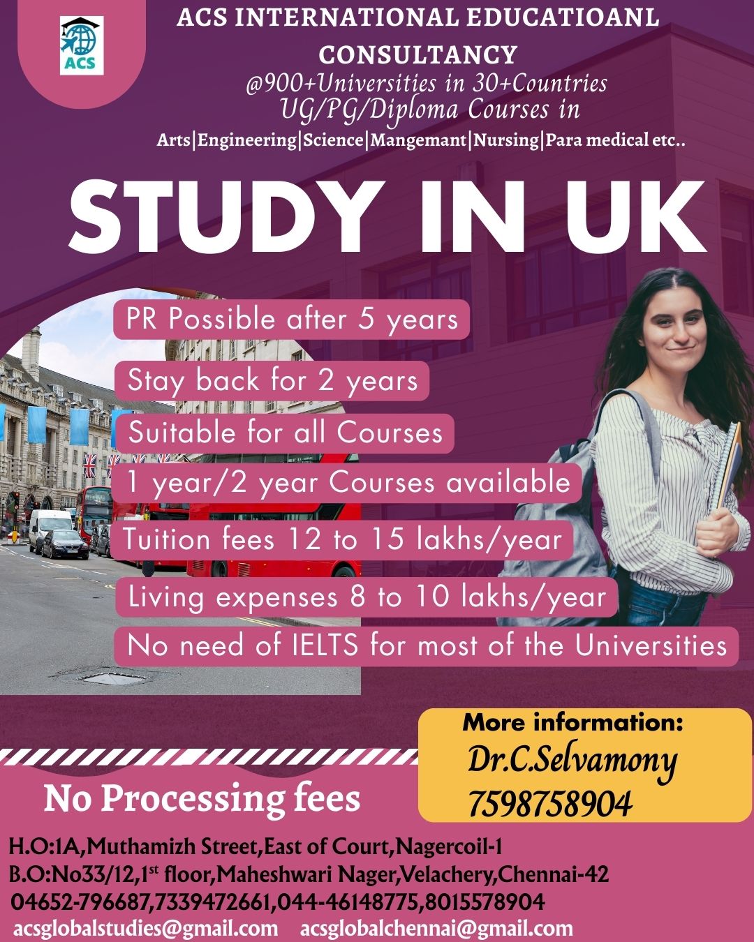 * We are Dealing with 800+ Universities in 30+ Countries * No Service Charges & No Money Dealings Free Process from students * Application to VISA Process * Free IELTS / GRE Online Coaching * One to One Free Counselling * Bank Loan Guidance
