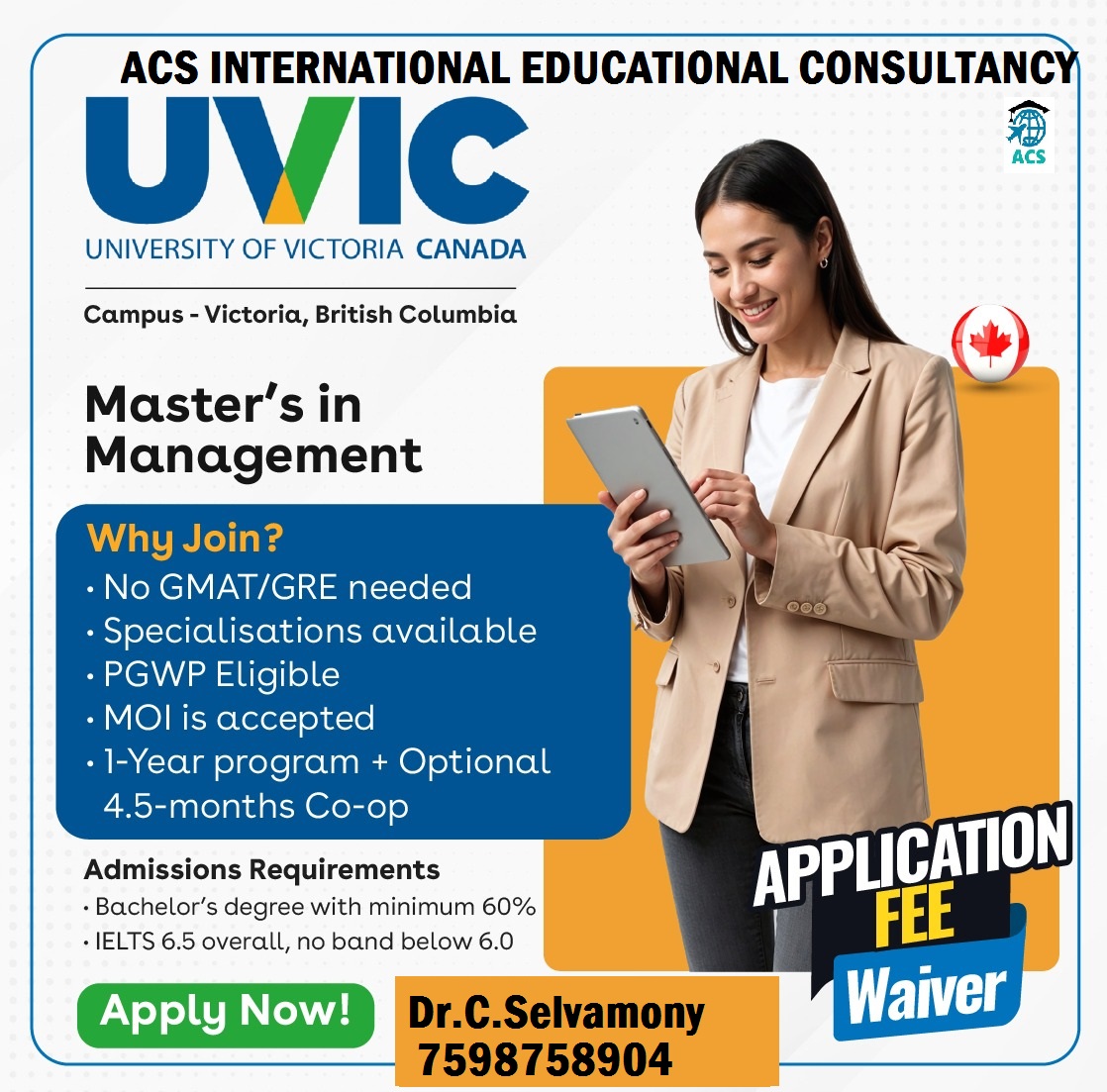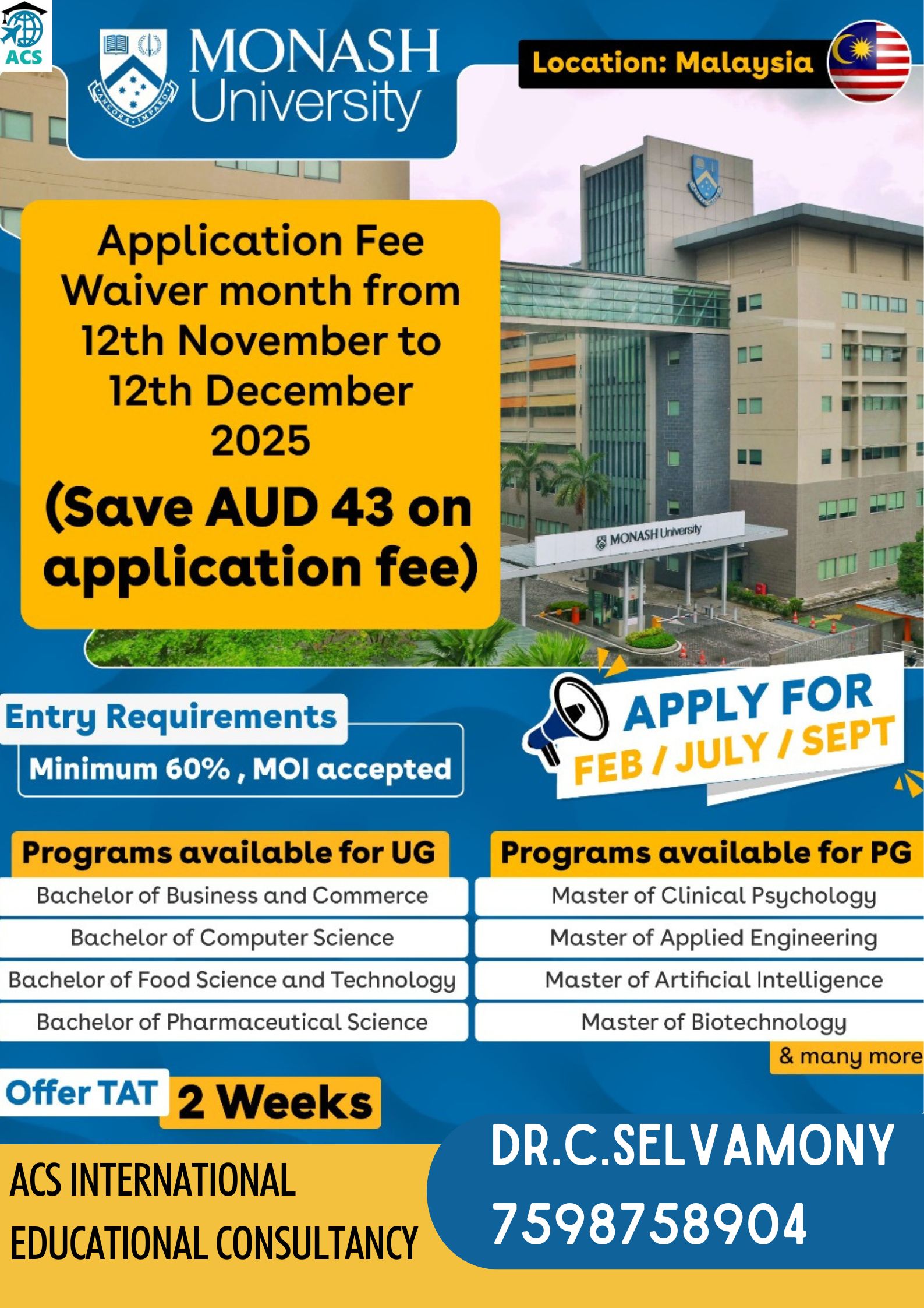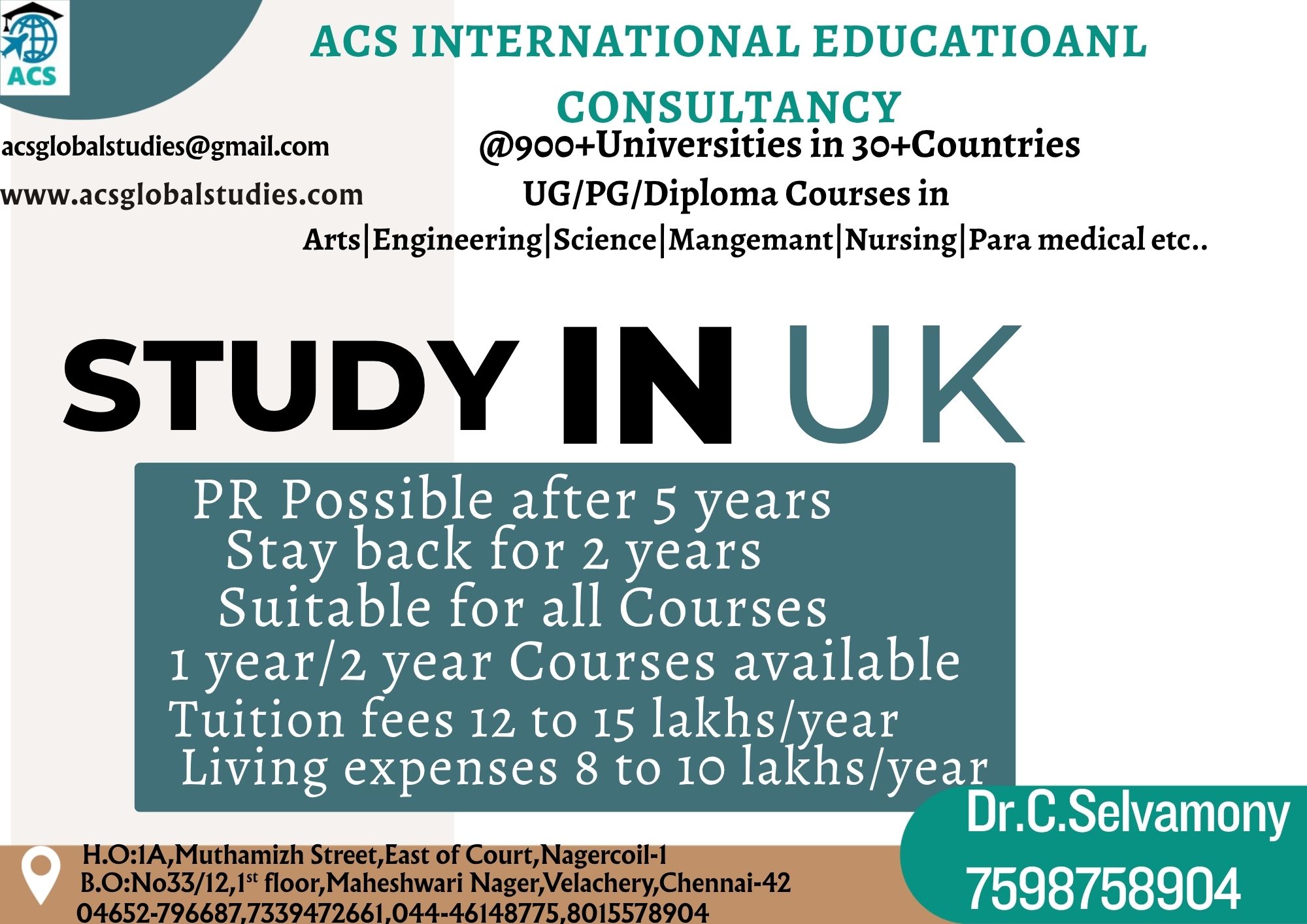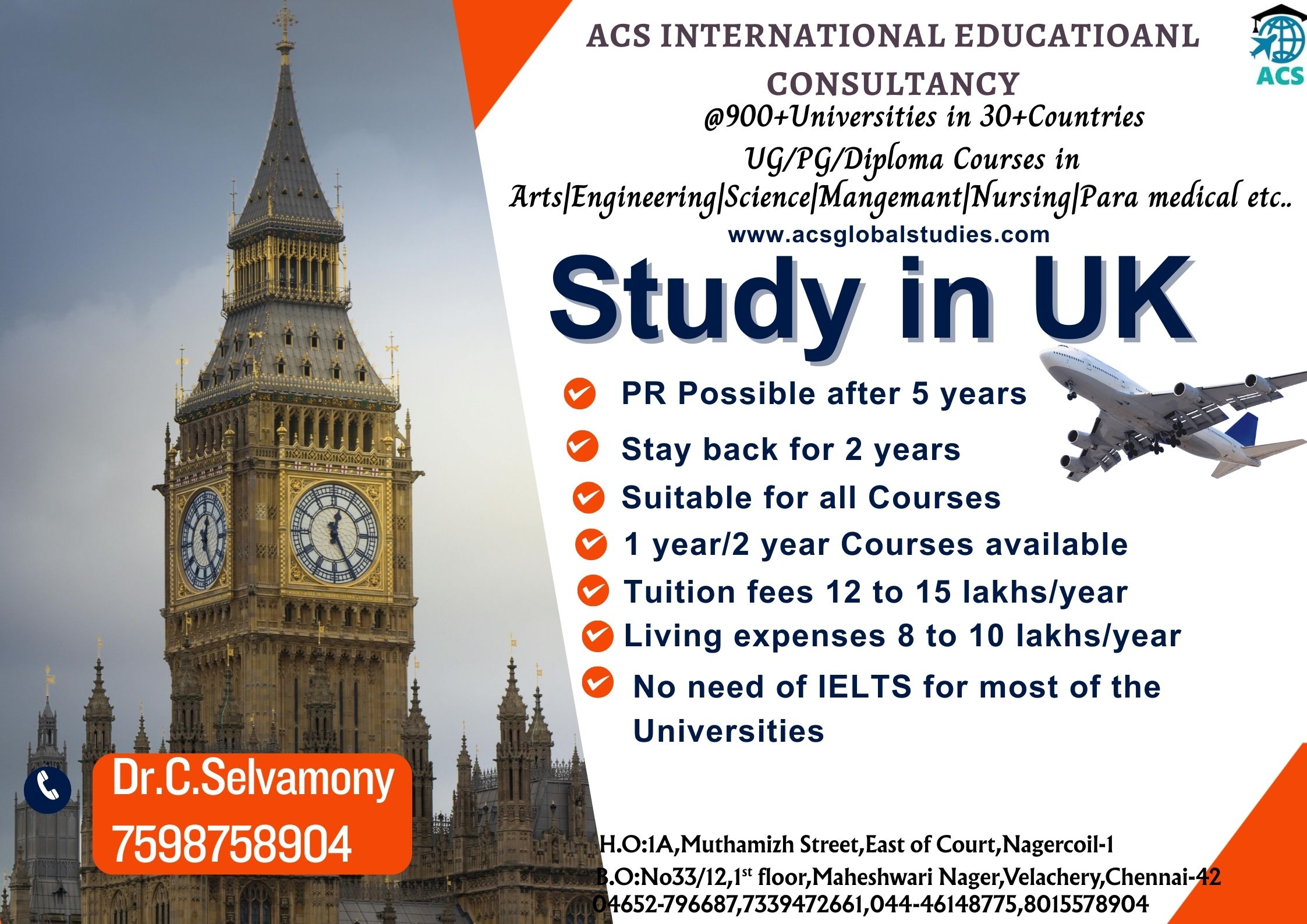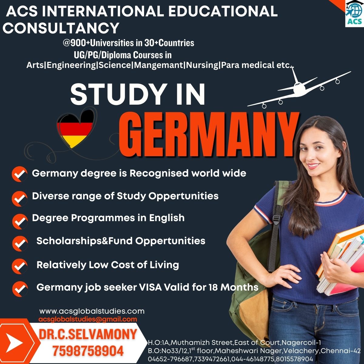 * We are Dealing with 800+ Universities in 30+ Countries * No Service Charges & No Money Dealings Free Process from students * Application to VISA Process * Free IELTS / GRE Online Coaching * One to One Free Counselling * Bank Loan Guidance